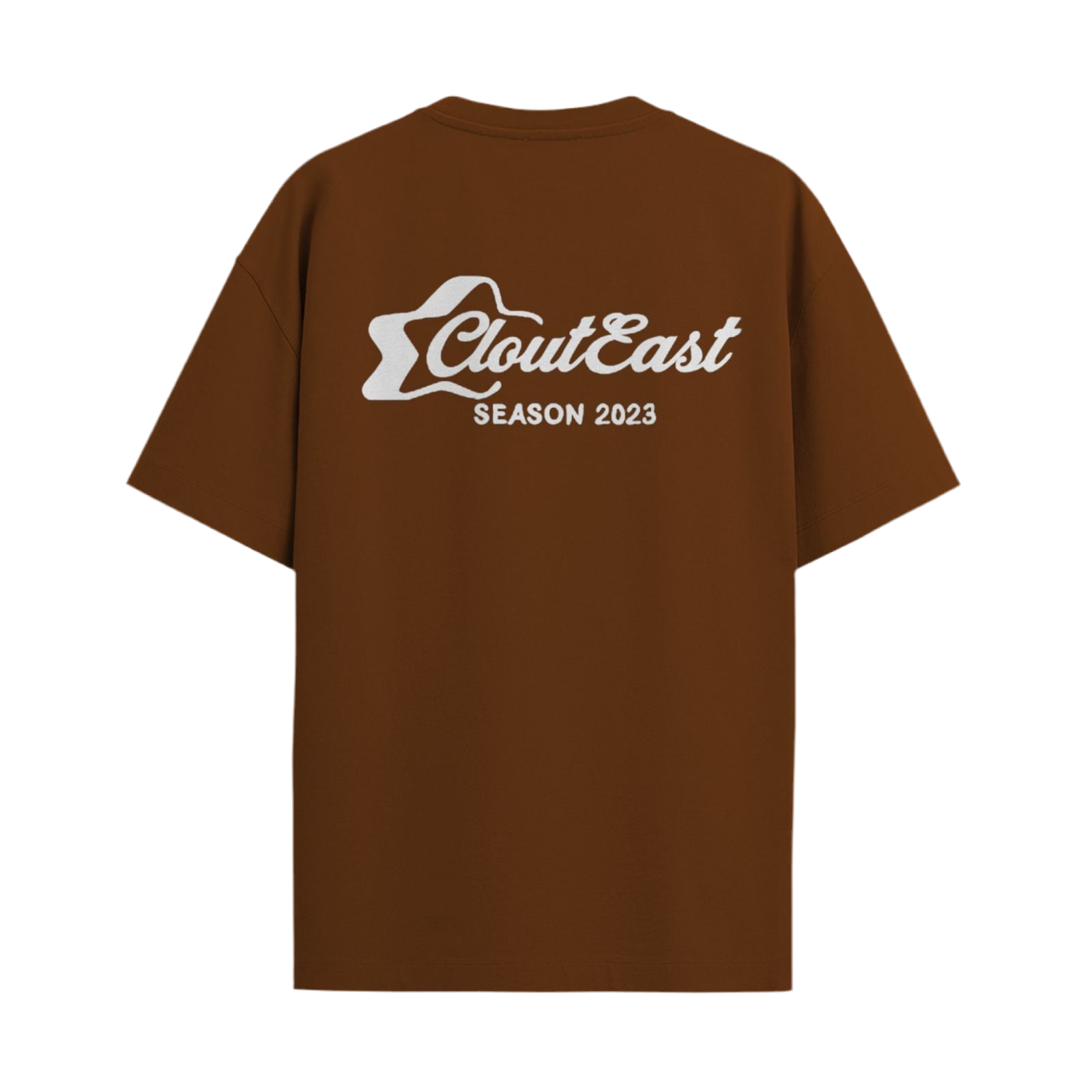 טישרט בגוון חום מבית "CLOUT EAST" בגזרת אוברסייז עם ריקמה תפורה בצידה של החולצה.